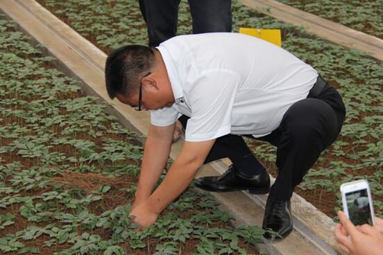 調(diào)研期間,云南天士力三七種植有限公司總經(jīng)理韋美膛對仿生種植工廠內(nèi)的三七生長狀況與傳統(tǒng)種植的三七進行了對比、評估。并針對工廠的避雨控病的措施提出了三七生長過程中,是否應該通過接觸自然雨露及土地,使得三七生長“接地氣”,從而長的更健壯的個人看法。也指出了工廠所用遮光板雖然遮光,但是否吸熱使得工廠內(nèi)部溫度升高,不利于三七生長的問題。