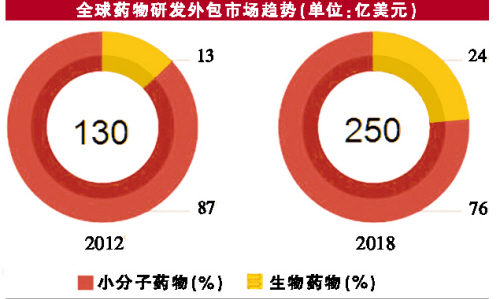 到2018年,在全球市場(chǎng)中,小分子藥物發(fā)現(xiàn)外包將有可能占3/4,達(dá)到近190億美元,生物藥物研發(fā)外包將可能占到1/4左右,也將會(huì)超過60億美元。